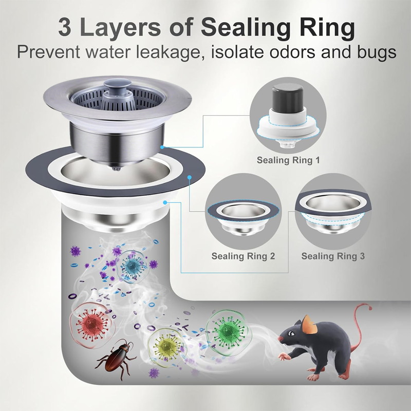 Our new sink strainer is designed with upgraded one-piece spring-loaded and 3 large drain holes for efficient drainage, preventing slow draining and clogging. And it's easy to clean up food waste without getting your hands dirty.